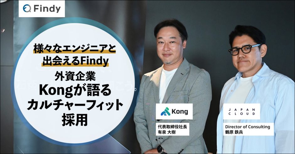 APIマネジメントに特化したソリューションを展開しているKong株式会社では、エンジニア採用においてスカウトサービス「Findy」をご活用いただいています。今回は、同社の代表取締役社長を務める有泉様と、同社を支援しているジャパン・クラウド・コンサルティング株式会社の鶴原様に、Findyを導入したきっかけや、同社で働く魅力についてお話を伺いました。