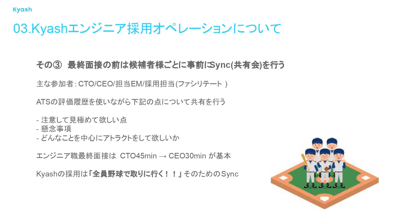 エンジニア職の最終面接は、最初にCTOが45分出て次にCEOが30分、というセットが基本内容です。Kyashの採用は「全員野球で取りに行く」というのが基本姿勢なので、そのための事前共有会という位置づけですね。